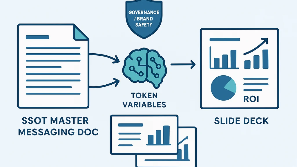 A doc-to-deck workflow uses a single, approved messaging document as the source of truth. AI maps doc sections to slides, applies tokenized personalization, and outputs decks that are ready for governance and distribution.
