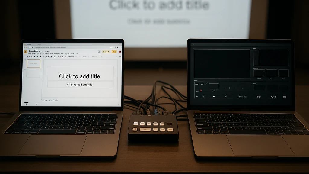 • Data point: two-laptop setups with a simple switcher have become a standard in mid-to-large events for Google Slides live event reliability. Quote: “A practical spine—one main show computer and a hot backup—beats heroic improvisation.” Key takeaway: hardware simplicity plus a reliable switcher is your on-stage insurance. Two laptops on a desk connected to a small HDMI/SDI switcher, with cables neatly organized, and a projector screen in the background showing a Google Slides deck.