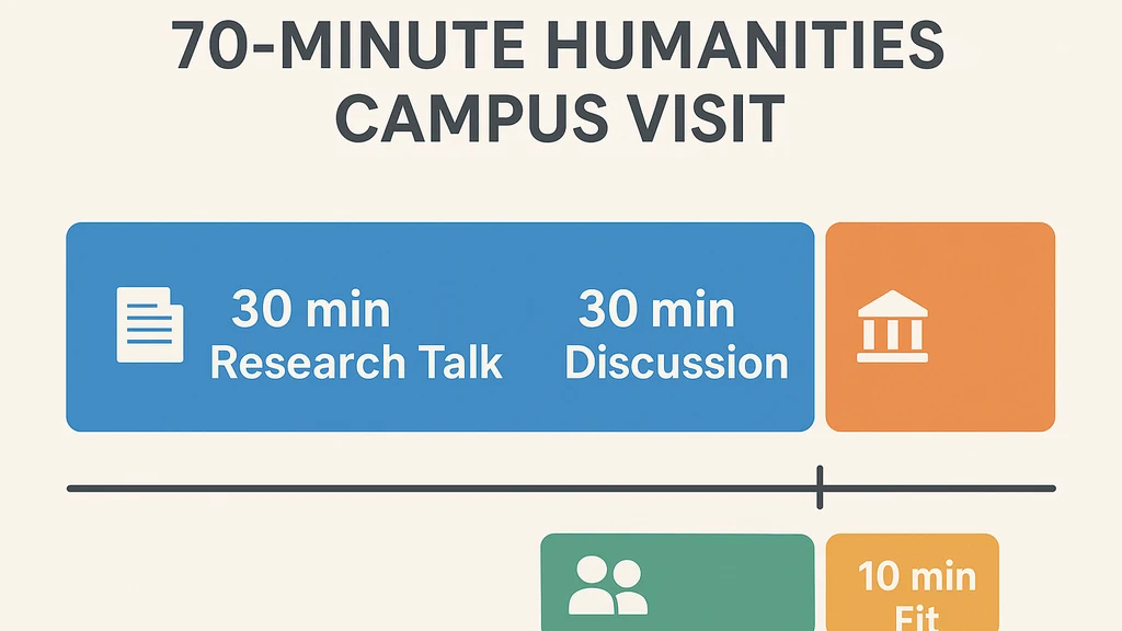 The recommended total visit window: 70 minutes split into three parts: 30 minutes for the research talk (outcome-first thesis and evidence arc), 30 minutes for discussion/Q&A, and 10 minutes dedicated to demonstrating fit through department-aligned messaging. This 30/30/10 job talk framework is a reliable way to balance the research narrative with collegial and curricular signals.