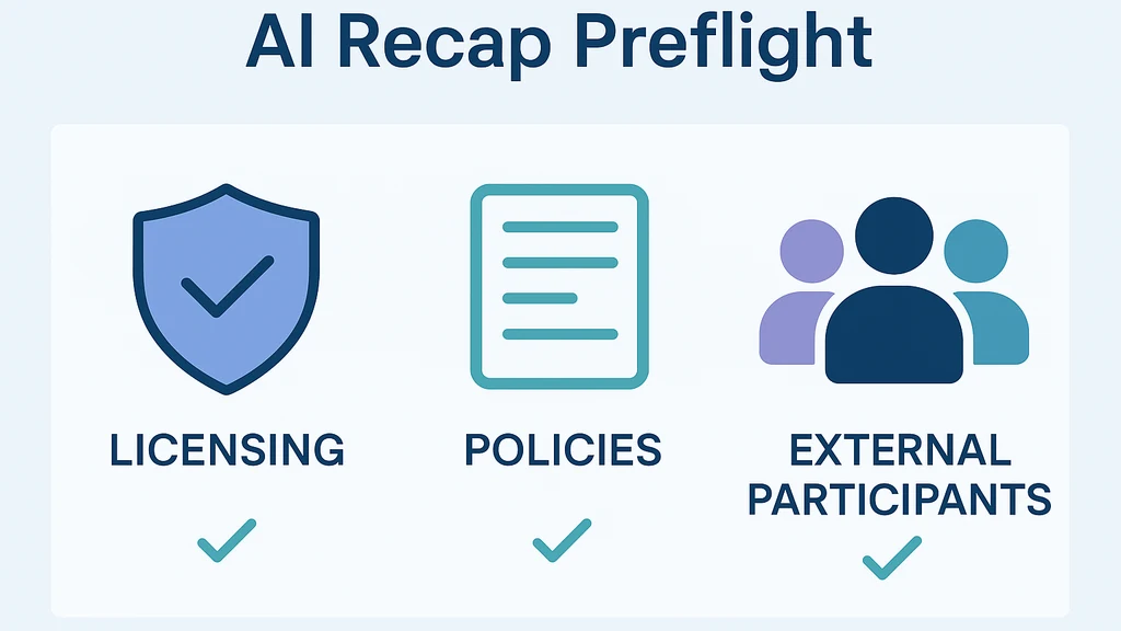 - Licensing and tenant readiness: Confirm you have the right license (Teams Premium or equivalent AI-capable plan) and that the AI Recap capability is enabled for your tenant. If AI features are off or not assigned to the user, AI Recap won’t appear for external meetings.