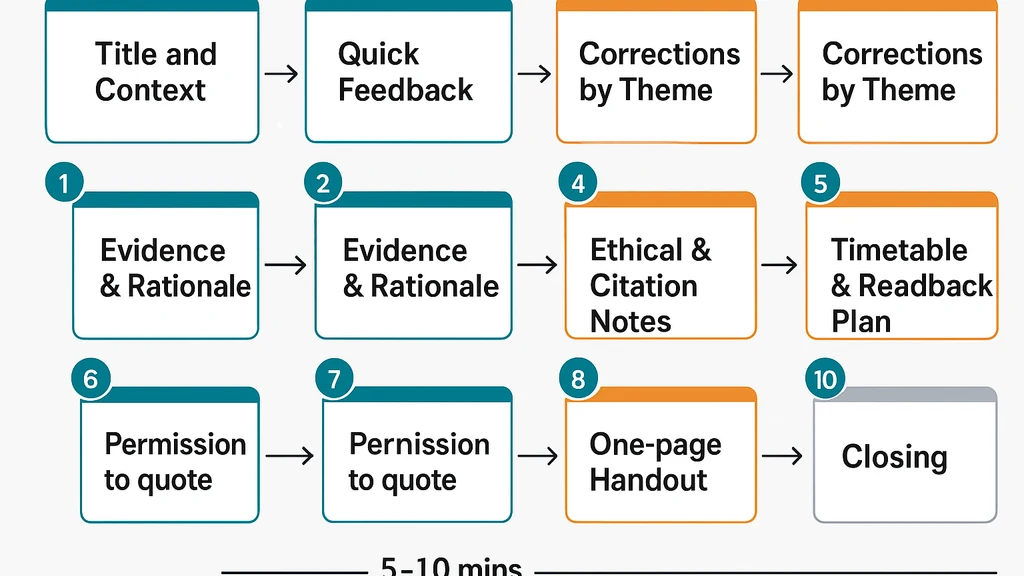 A viva corrections presentation should be transparent, respectful, and tightly organized. Decide early whether to quote examiners, and only with explicit permission. Cite examiner feedback as personal communication when appropriate. Build a 5–10 minute corrigenda briefing with a clear slide outline and a one-page handout, then adapt it for email or Teams handback to maximize clarity and professionalism, while honoring the ethics of attribution.