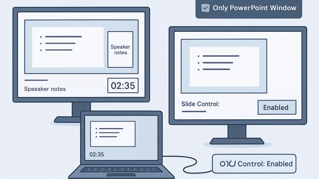 - Practical tip: Always share the PowerPoint window (not your entire desktop) and enable Slide Control for the co-host, then verify that arrow keys advance slides only when you intend. The audience sees only the PowerPoint deck, not your desktop or notes.