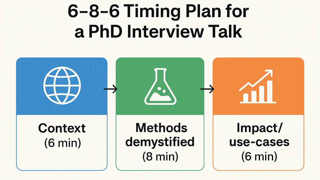 専門家以外の聴衆にも理解できる計算方法についての20分間のPhD面接プレゼンテーションには、6–8–6 のタイミングマップを使用します: コンテキスト(6分) → 「手法の解明」(8分) → 影響/ユースケース(6分)。「手法の解明」スライドのパターンに従います:平易な言語の主張、最小限の数式ビジュアル、具体的な前後の例、そして1つの制限点。2つの安全なデモオプション(30秒の録画マイクロデモまたは2スライドの静的ウォークスルー)と、質疑応答用の3枚の「厳密性の証明」付録を用意します。Zoomや対面発表に対応できるハイブリッド用ガードレールを構築します。要点: 明確性、ペース配分、検証可能な厳密性が、混成聴衆の理解をPhD面接プレゼンテーションで引き出します。