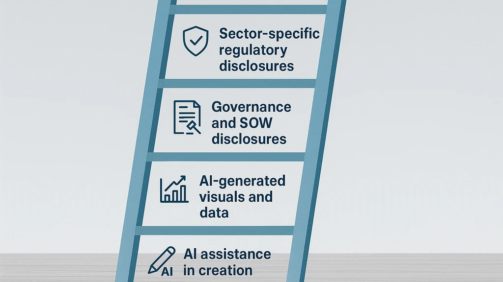 Lestvica se sastoji od četiri nivoa: (1) AI pomoć u kreiranju (priznavanje), (2) AI-generisani vizuali ili podaci sa označavanjem i poreklom, (3) upravljanje i SOW otkrivanja (ugovorno usklađivanje), (4) sektor-specifična regulatorna otkrivanja (usmerena ka usklađenosti). Napredujte po lestvici kada sadržaj ispunjava kriterijum materijalnosti (uticaj na donošenje odluka, integritet podataka ili regulatorna relevantnost).