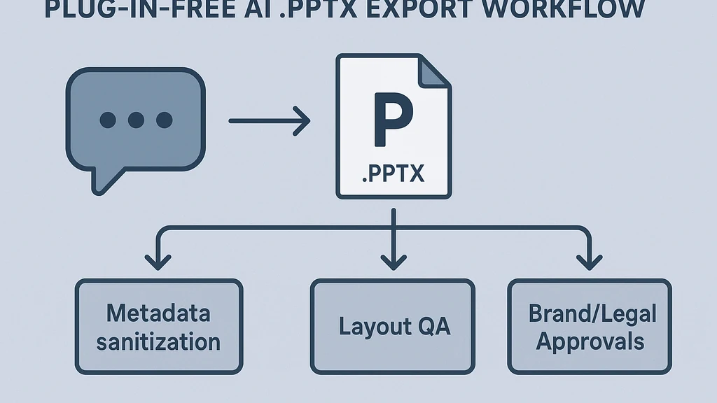 Upptäck ett AI PowerPoint PPTX-exportarbetsflöde som är pluginfritt och revisionsklart. Lär dig promptar, metadatahygien och QA efter export för att påskynda presentationerna.