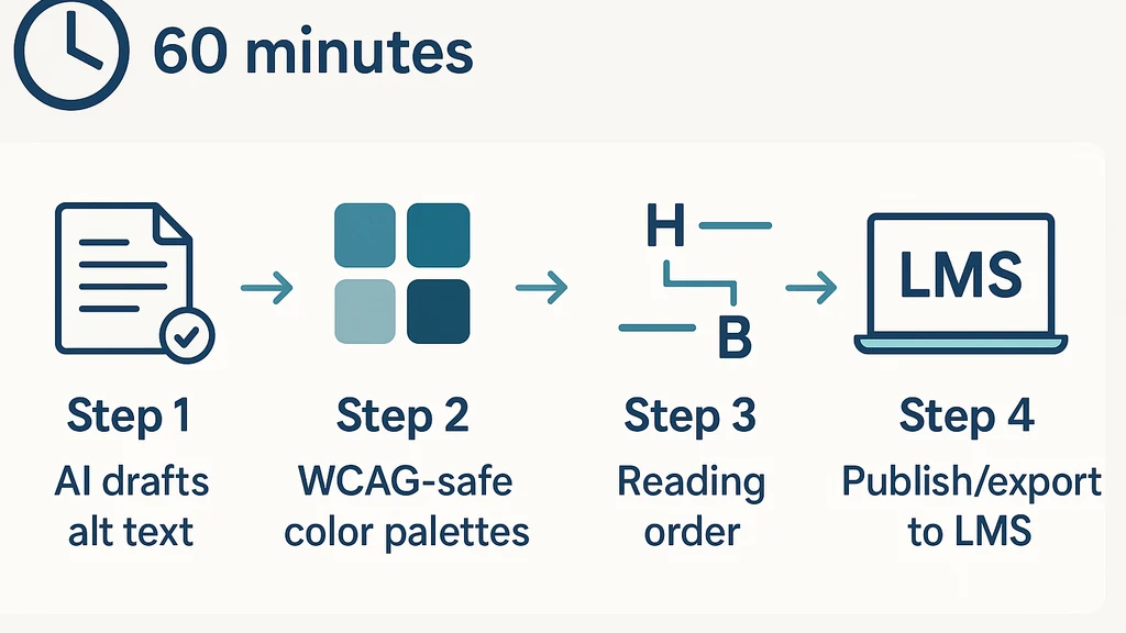 Слайди, сумісні з ADA, можна досягти приблизно за 60 хвилин за допомогою вбудованих інструментів та легкого ШІ. Пакетно згенеруйте альт‑текст для зображень та діаграм, застосуйте палітри кольорів, що відповідають WCAG, виправте порядок читання та заголовки, і опублікуйте повторювану процедуру для експорту в LMS. Більшість наборів потребуватимуть людських правок лише для кількох зображень, тоді як ШІ виконує основну роботу над рештою. Головний висновок: ви можете переобладнати типовий набір із 15–25 слайдів за одну годину за допомогою повторюваного робочого процесу.
